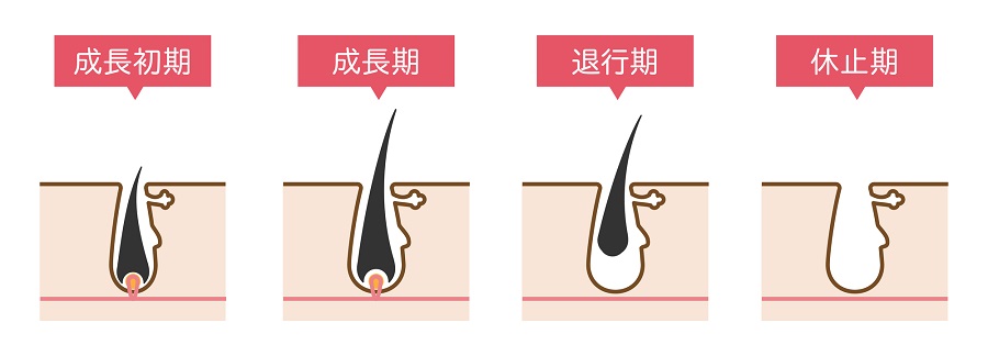 毛には周期があります。この中で脱毛の効果が出るのは、毛乳頭と毛が繋がっている「成長期」の毛のみです。いま目に見えている毛は100%の毛ではありません。肌表面に出ている毛は全体の10~30%です。全体の5~15%が成長期の毛です。1回の照射で効果が出る毛は成長期である5~15%です。すべての毛に反応させていくには、平均して12~15回ほどの施術が必要になります。順調に効果を出していくために、照射してから毛が目立ち始める頃、1~2ヶ月に1回程度を目安に照射していきます。