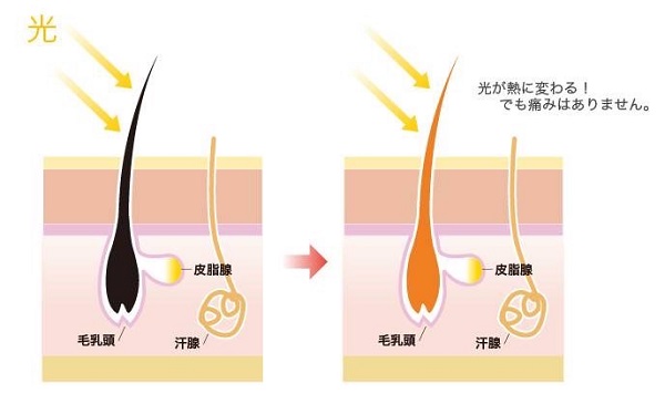 当店では美容ライト脱毛(IPL脱毛)を導入しています。自然界のルールで光は黒いものに反応します。毛も同じように黒い色素を含んでいるため光に反応します。光が熱に変わることによって、毛を作る工場である毛乳頭にアプローチします。毛乳頭が毛細血管から栄養を受け取ることができず、毛を成長させることができなくなります。成長できなくなった毛は個人差がありますので、照射後2週間程度で自然に抜け落ちます。