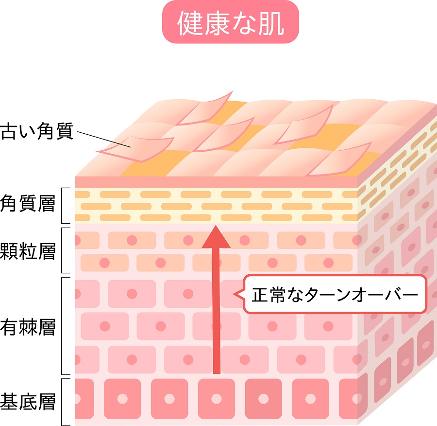 私たちの表皮はターンオーバーを繰り返しています。表皮は4層からできており、一番下の基底層から細胞が生まれて14日ほどかけて角質層まで押し上げられます。また、14日ほどかけて角質が剥がれ落ちていきます。